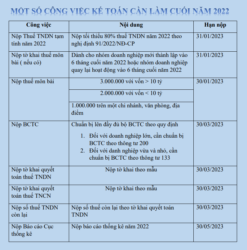 | Báo cáo quyết toán thuế TNCN | Chậm nhất ngày cuối cùng của tháng thứ 3 của năm sau | Cơ quan thuế |